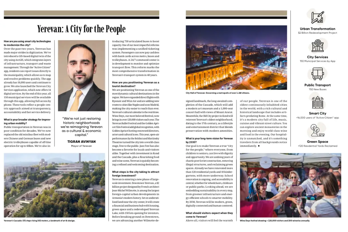 - Մենք դիրքավորում ենք Երևանը որպես տարածաշրջանի ամենադինամիկ մշակութային վայրերից մեկը։ Ընդլայնել ենք ուղիղ չվերթերը Ryanair-ի և Wizz Air-ի հետ և ավելացնում ենք նոր երթուղիներ դեպի Նեապոլ և շուտով նաև Մադրիդ՝ դարձնելով քաղաքը ավելի հասանելի, քան երբևէ։ Երևանի մշակութային օրացույցն իսկական գրավիչ է։ Գինու օրերը՝ մեր ամենասիրված փառատոնը, այժմ ամեն տարի ավելի քան 120․000 այցելու է բերում։ «Երևանի բալետային փառատոնը» և «Ոսկե ծիրան» կինոփառատոնը համաշխարհային ճանաչում են բերում։ «Ոսկե ծիրան»-ը հյուրընկալել է հայտնի ռեժիսորների, դերասանների և մշակութային խորհրդանիշների։ Այս տարի «Բոլշոյ» և «Մարիինյան» թատրոնների բացօթյա ներկայացումները քաղաքը վերածեցին համաշխարհային մակարդակի բեմի, որտեղ մուտքն անվճար էր հանրության համար։ Jazz Fest փառատոնն էլ սիրված է թե՛ տեղացիների, թե՛ հյուրերի շրջանում։ Կոնդ թաղամասի և Կասկադի զարգացումը, ինչպես նաև հարուստ գինու և խոհանոցի մշակույթը դարձնում են Երևանը նրբաճաշակ ու հյուրընկալ զբոսաշրջային կենտրոն։