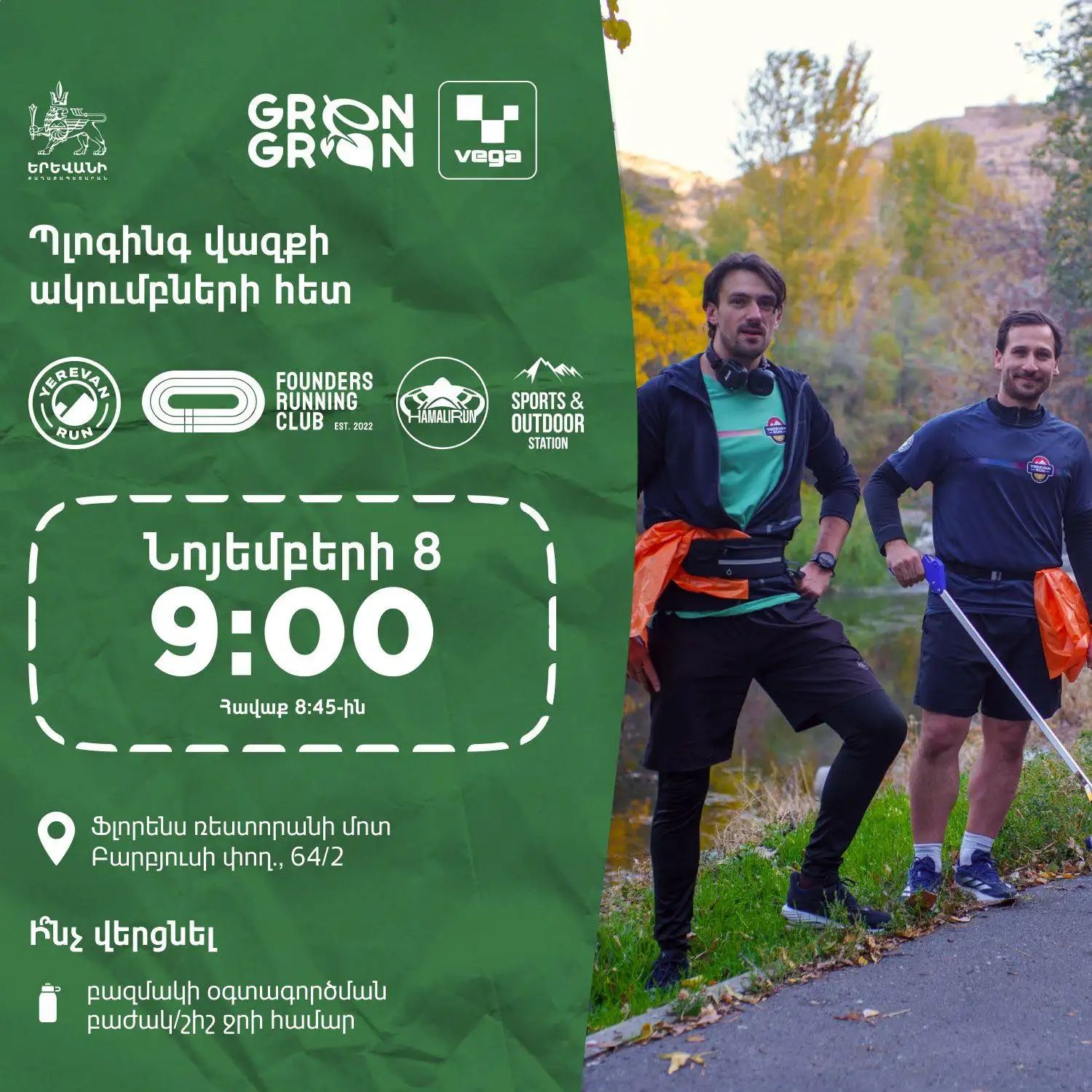 Այս շաբաթ օրը առավոտյան մենք կմիավորվենք Երևանի երեք վազքի ակումբների՝ Yerevan Run, Founders Running Club, Hamali Run անդամների հետ և կմասնակցենք պլոգինգ ակցիային Հրազդանի ձորում՝ մարզիկների համար փակված հատվածում՝ «Ֆլորենս» ռեստորանից մինչև Դավթաշենի կամուրջ։