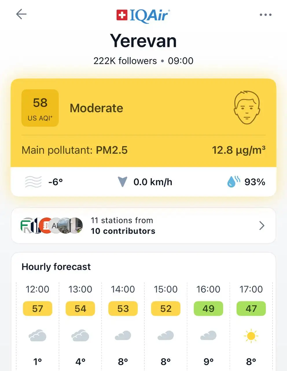 Ըստ IQAir-ի՝ Երևանում օդի աղտոտվածության վիճակն այս պահին «չափավոր» սանդղակում է, իսկ օրվա ավարտին սարքերը կանխատեսում են «լավ» ցուցանիշ։