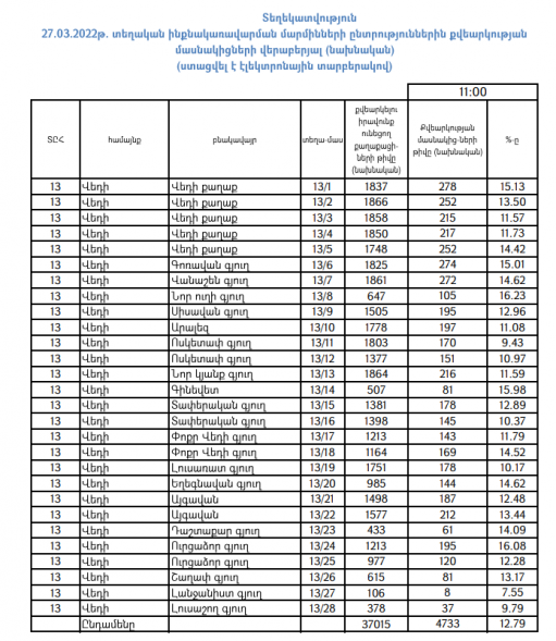По состоянию на 11:00 во внеочередных местных выборах в укрупненной общине Веди Араратской области приняли участие 4733 или 12,79% из 37198 имеющих право голоса избирателей. Об этом сообщает сайт Центральной избирательной комиссии.