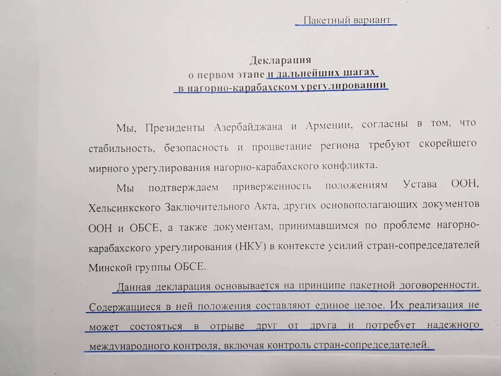 По данным офиса Сержа Саргсяна это первые три абзаца документа сторон переговоров по мирному урегулированию нагорно-карабахского конфликта в августе 2016 года с предложением, представленным Минской группой ОБСЕ