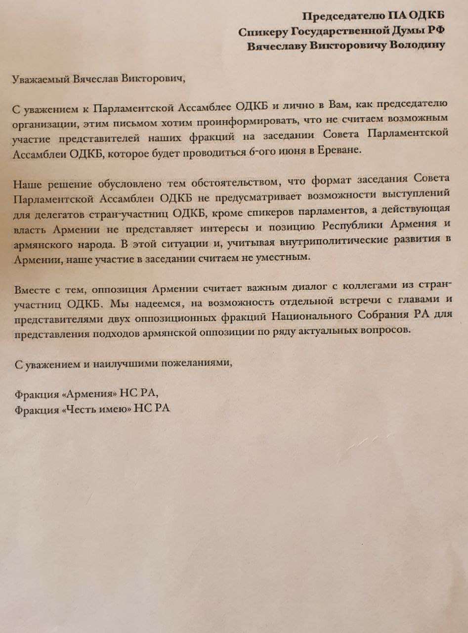 В Интернете была распространена копия письма, якобы адресованного спикеру Государственной Думы РФ Вячеславу Володину блоками «Армения» и «Честь имею».