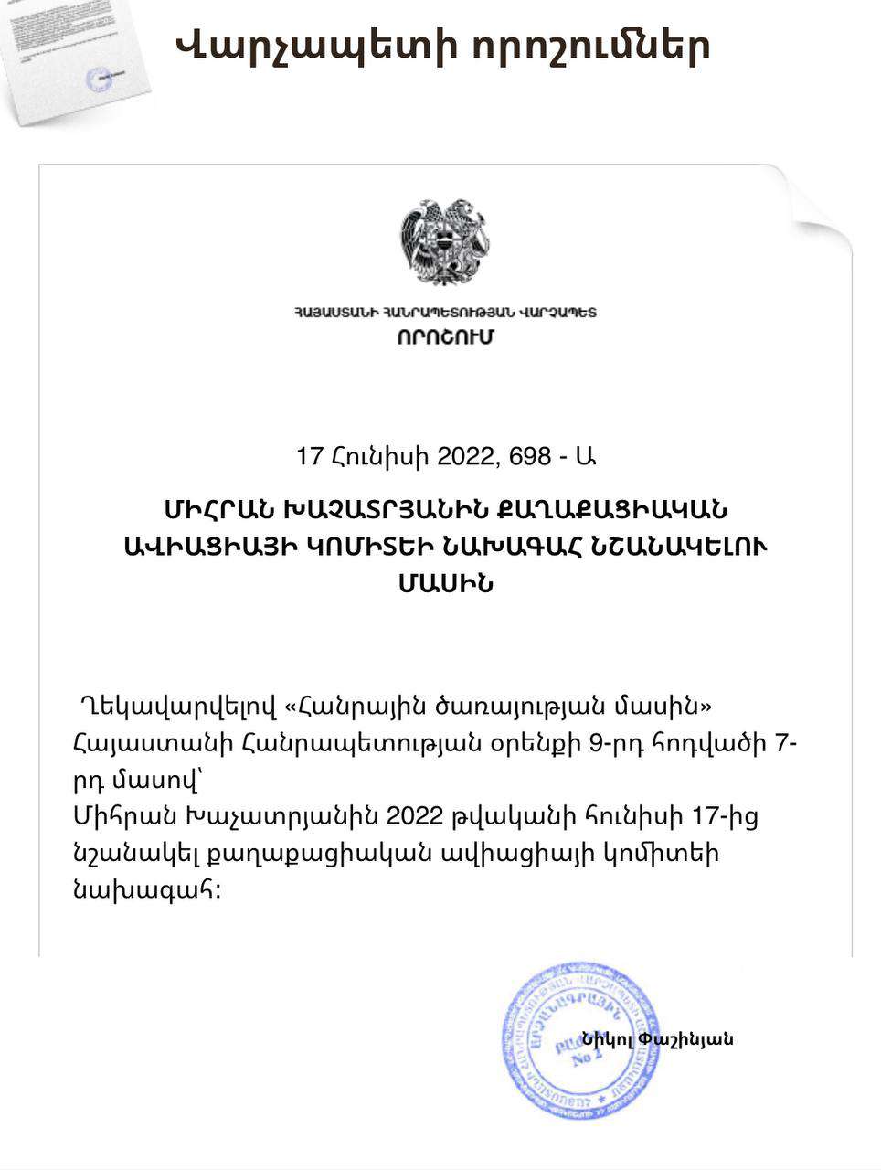 "Мигран Хачатрян назначен председателем Комитета гражданской авиации 17 июня 2022 года", - говорится в постановлении премьер-министра.
