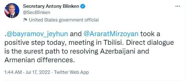 По поводу встречи госсекретарь США Энтони Блинкен написал в Твиттере: «Арарат Мирзоян и Джейхун Байрамов сделали позитивный шаг, встретившись в Тбилиси». Прямой диалог — верный путь к разрешению азербайджанских и армянских разногласий».