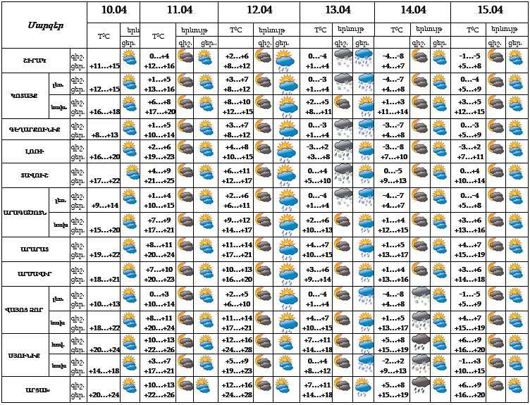 10, 11, 12, 14 и 15 апреля в Армении осадков не ожидается. Осадки ожидаются днем 12-го, 13-го, ночью 14-го в отдельных районах, 13-го в горных районах в виде снега. Ветер будет 3-6 м/с западный, 11-13 апреля в отдельных районах усилится ветер со скоростью 18-23 м/с.