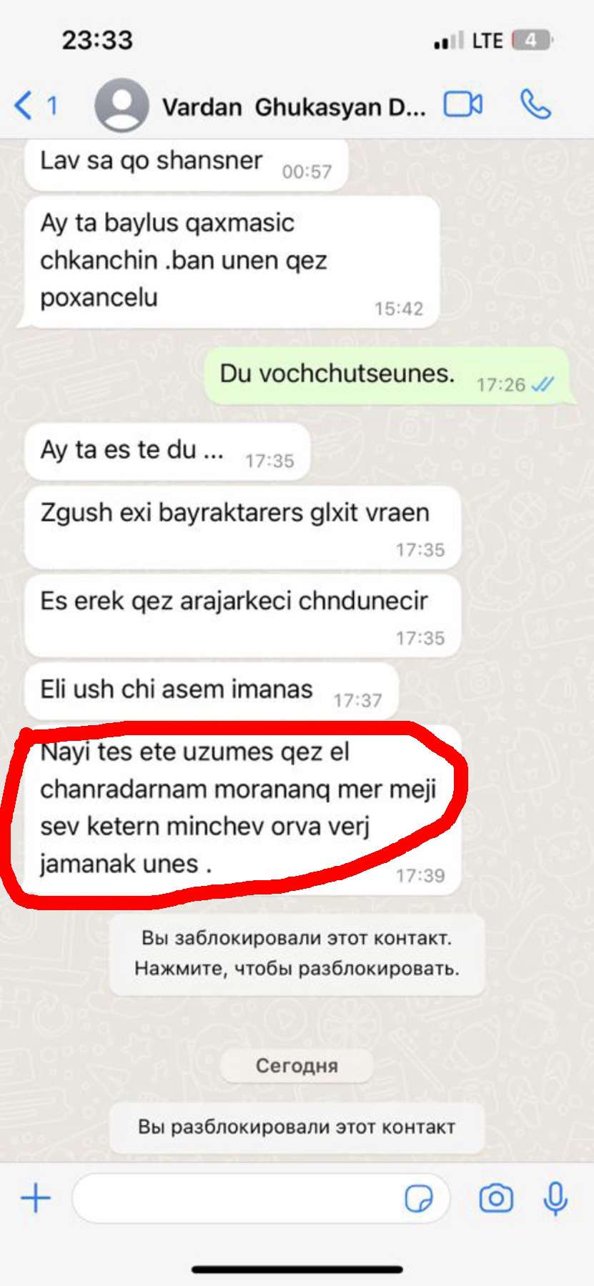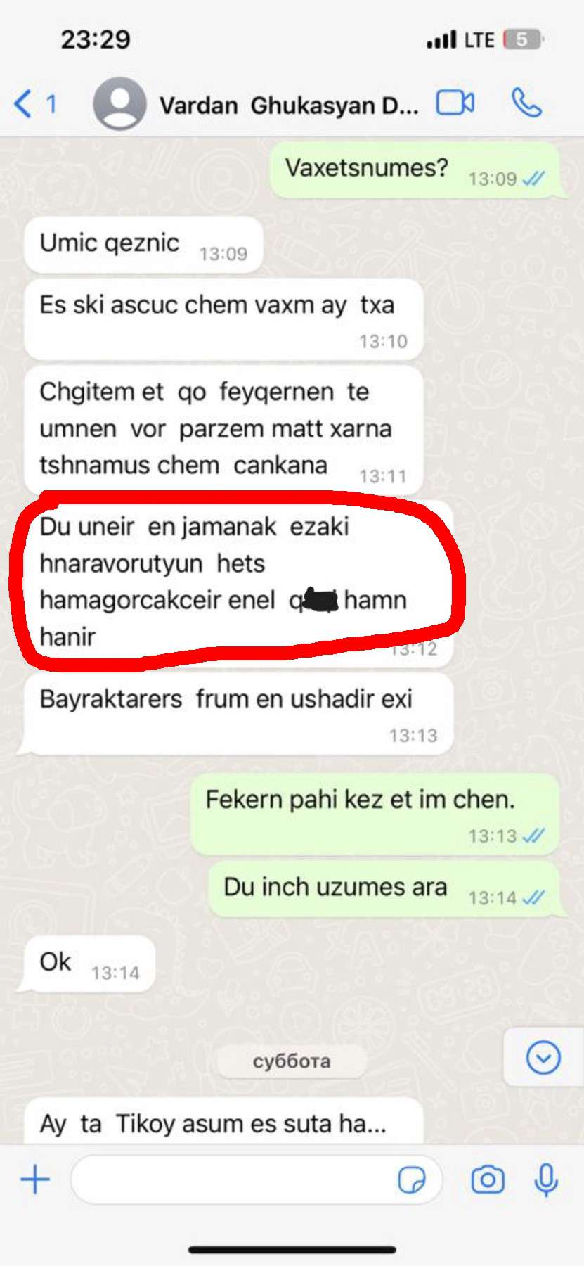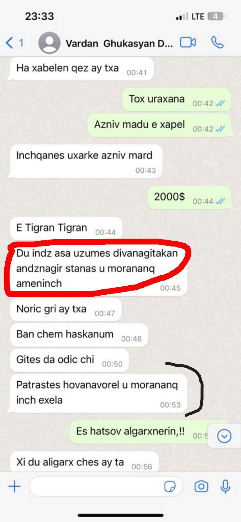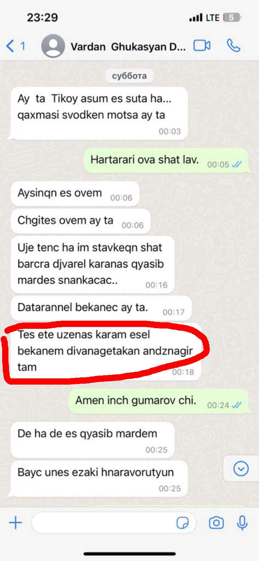 Ниже приведены скриншоты соответствующих и важных частей разговора Вардана Гукасяна с представителем ночного клуба, а также Т.А. (с согласия последнего), полученные в рамках уголовного производства.