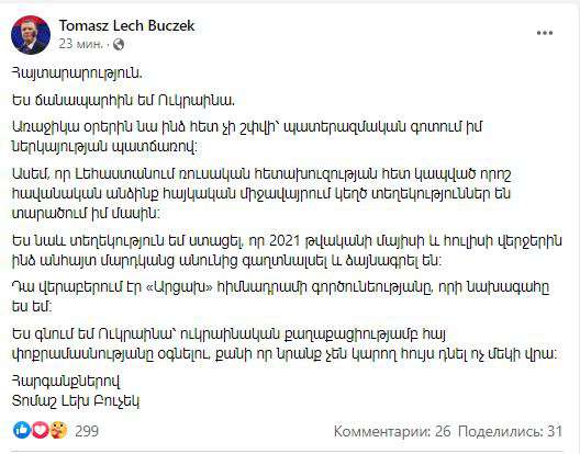 Польский юрист и политик Томаш Лех Бучек написал на своей странице в Facebook, что выезжает в Украину, чтобы помочь армянской диаспоре: