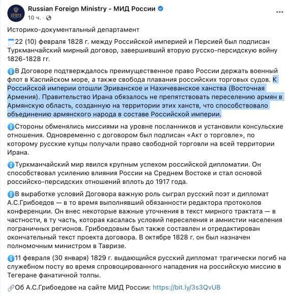 «К Российской империи отошли Эриванское и Нахичеванское ханства (Восточная Армения). Правительство Ирана обязалось не препятствовать переселению армян в Армянскую область, созданную на территории этих ханств, что способствовало объединению армянского народа в составе Российской империи.», — говорится в сообщении МИД России.