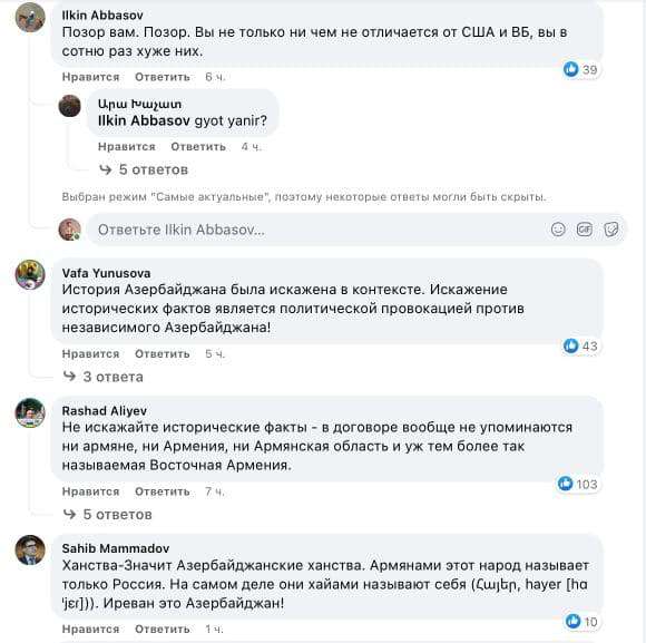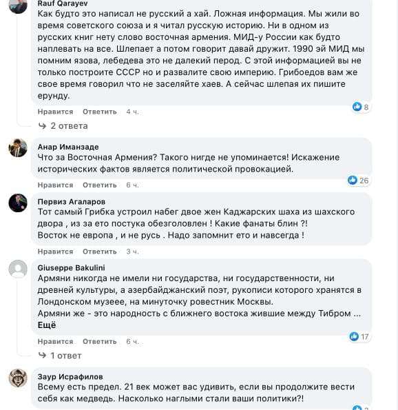 Азербайджанцев возмутило упоминание Восточной Армении в скобках. В Баку заявили, что ожидают «исправления искаженной информации», но а тем временем сразу несколько батальонов "диванных" войск Азербайджана атаковали страницу МИД РФ в Facebook (скриншоты прилагаются)